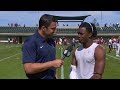 Pac-12 Networks' Evan Moore speaks with Paulson Adebo after Stanford's Cardinal and White Spring Game. Adebo had an interception and broke up a key pass for the team on Saturday.Paulson Adebo pleased with Stanford's defense in spring game: 'The effort was definitely there' football score | |